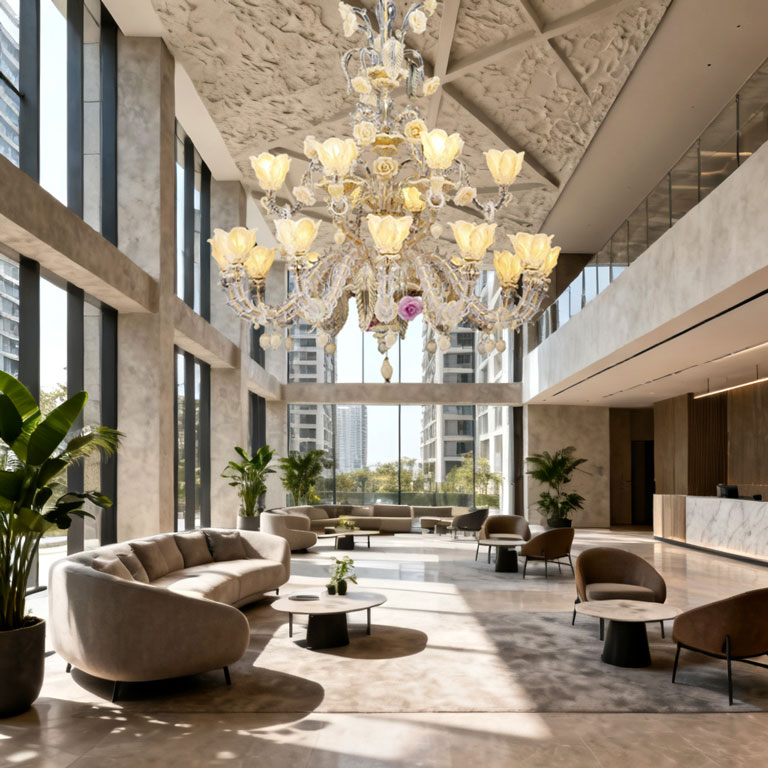 High-End Restaurants: Warm light filters through glass petals and green edges, creating a romantic dining atmosphere ideal for private banquets and clubs.