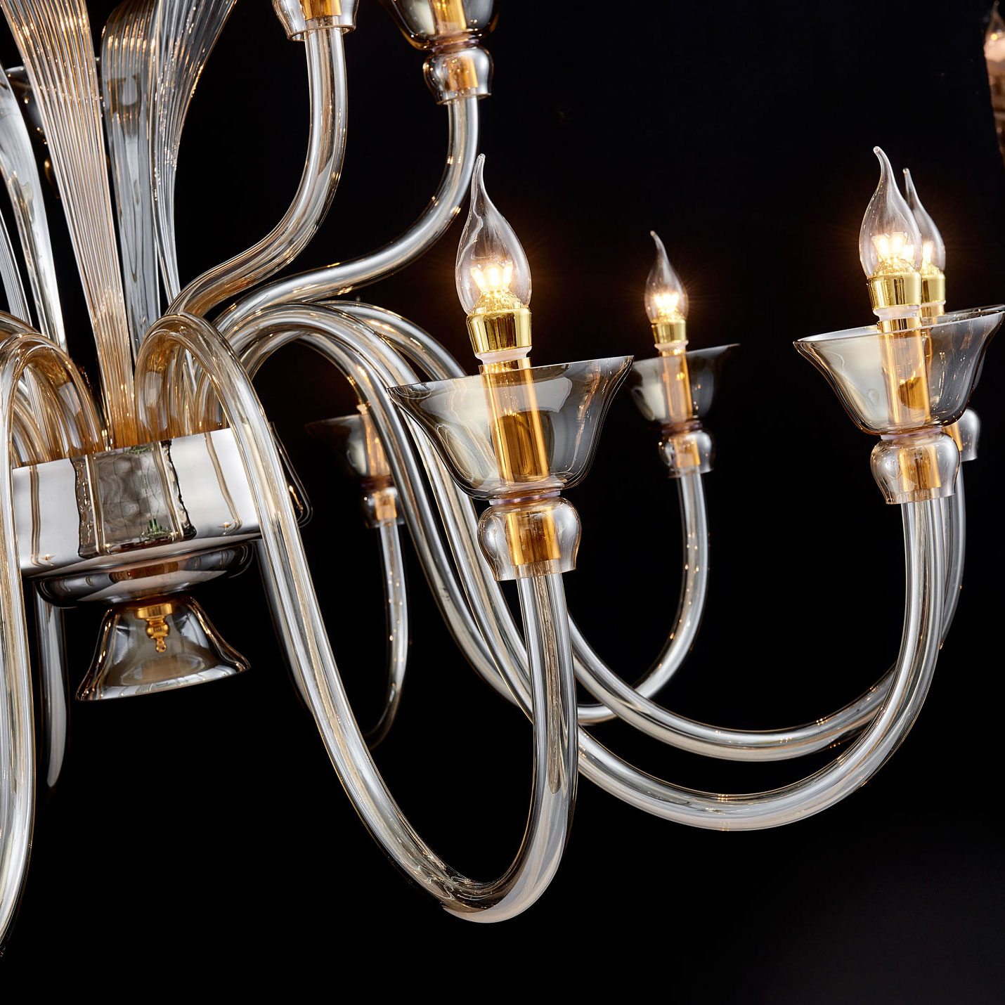 The clear S-shaped glass arms cascade in layers, creating a light, airy silhouette that dances with sunlight by day and casts soft, warm glows by night.