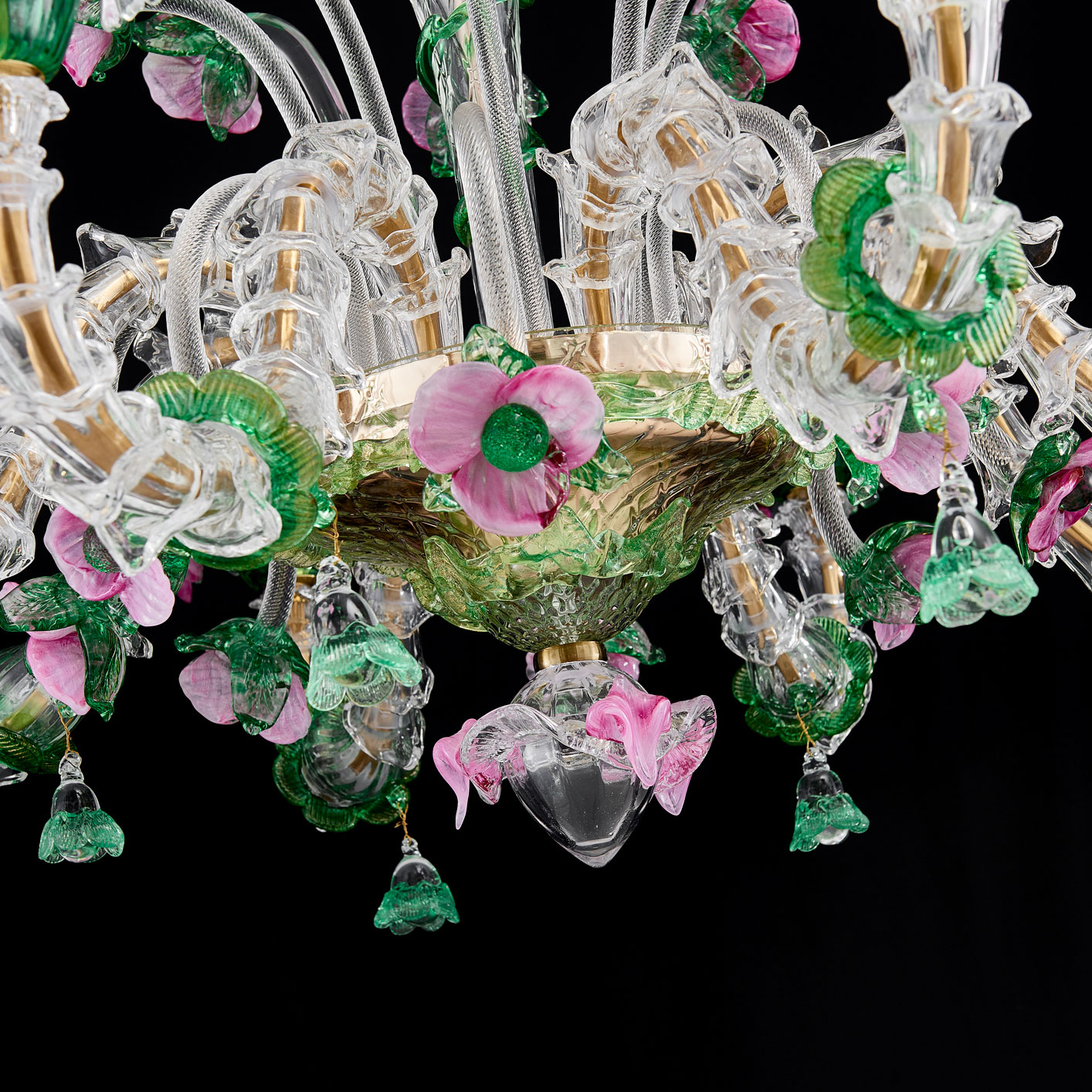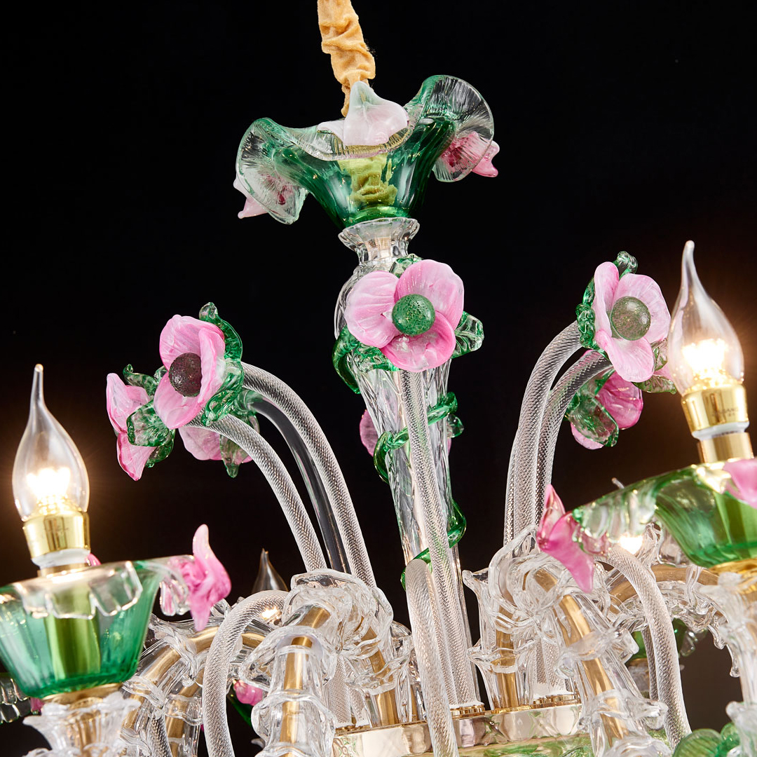 Lush green-edged petals meet transparent S-shaped layered arms — this handmade glass flower chandelier is a