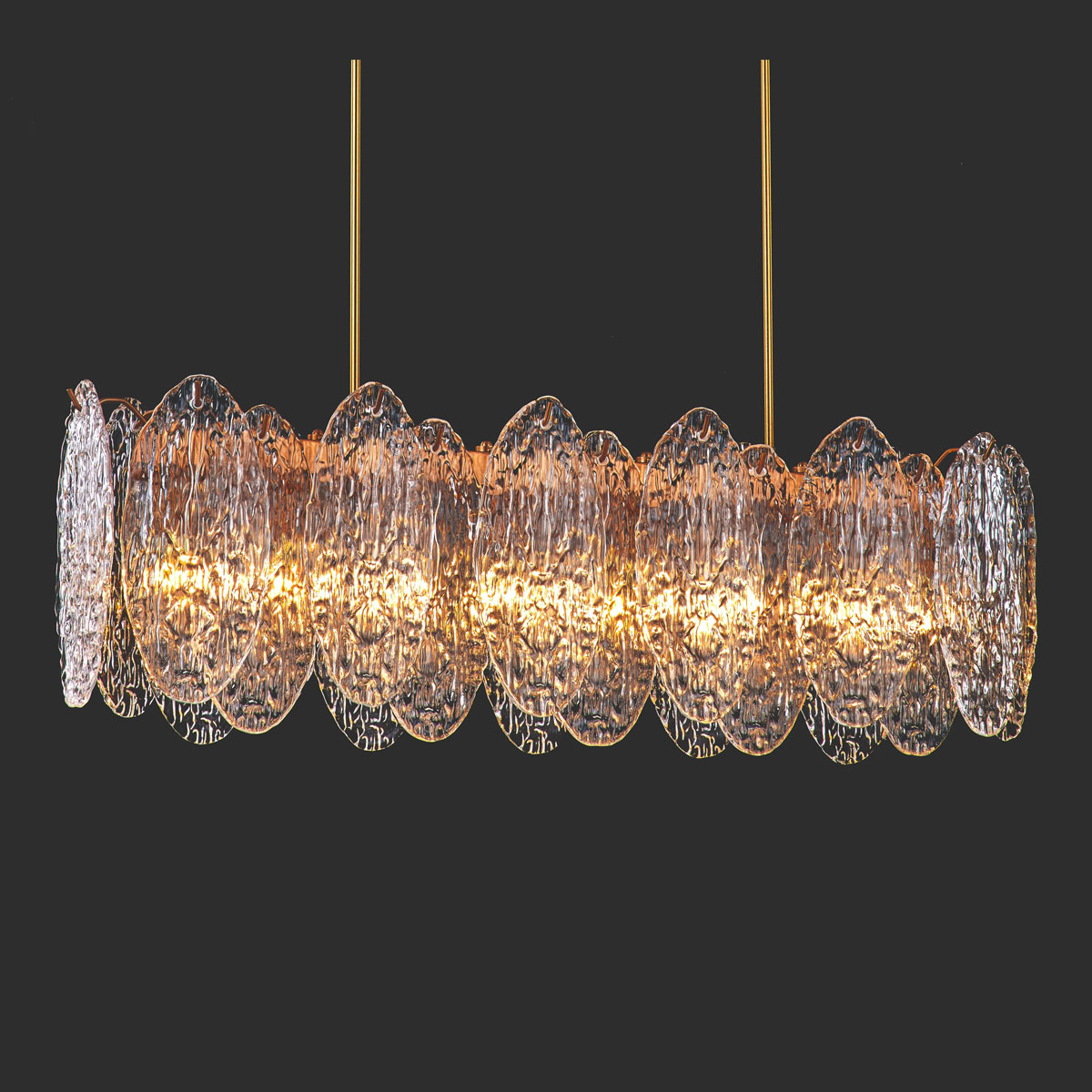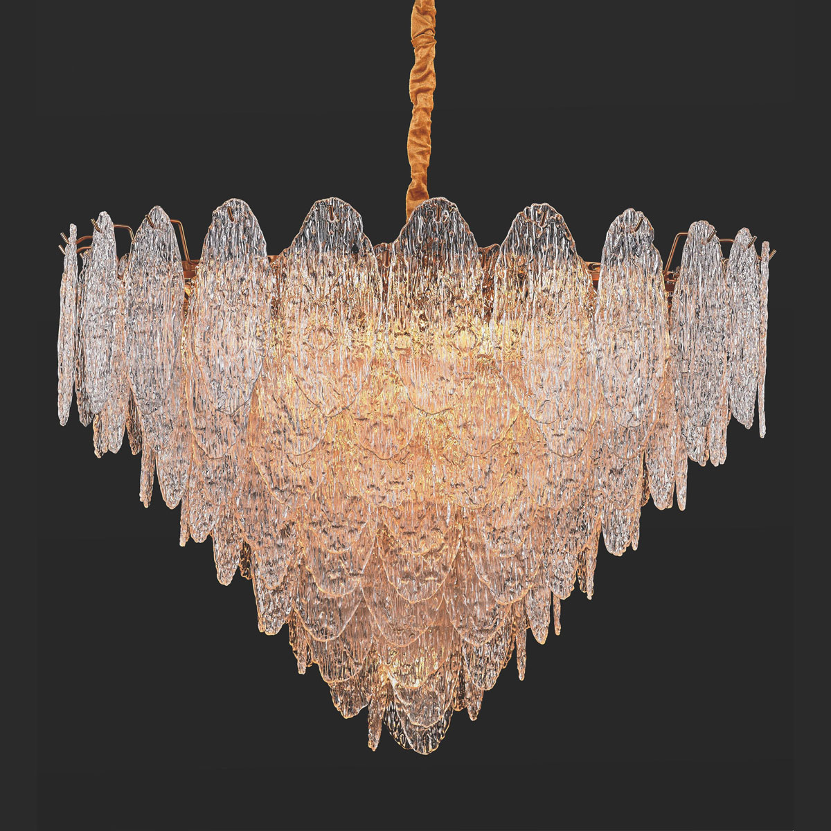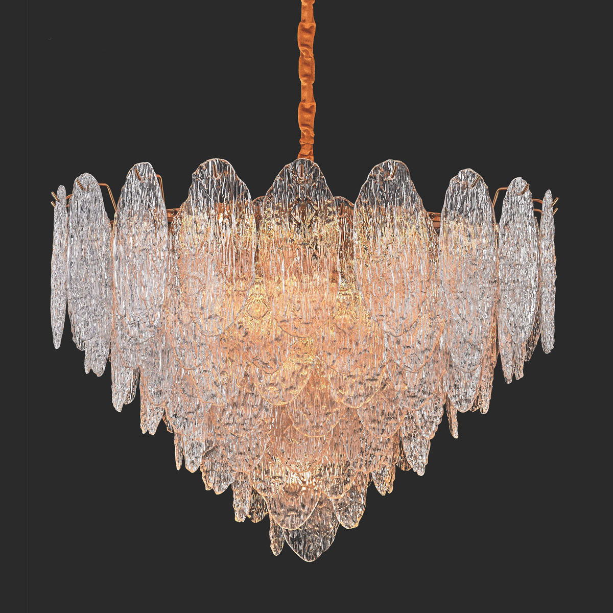 Each curve is meticulously shaped by artisan hands, harmonizing opulence with minimalist refinement through lu-minous glass layered over metal-lic/wooden bases. The multi-layered luminous refraction system diffuses ethereal, moonlit radiance, while ad-justable warm/cool lighting adapts to any ambiance. Sleek lines frame con-temporary artistry, reinterpreting Ba-roque motifs into modern patterns.