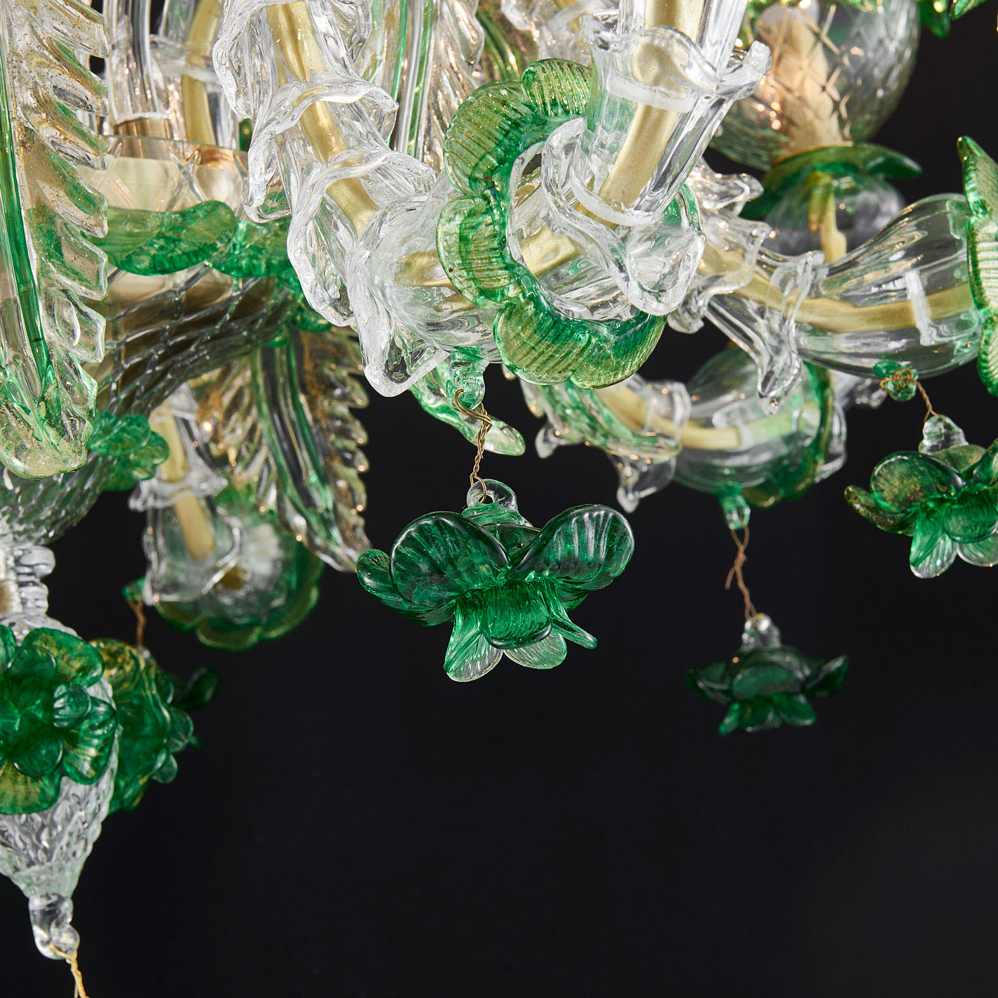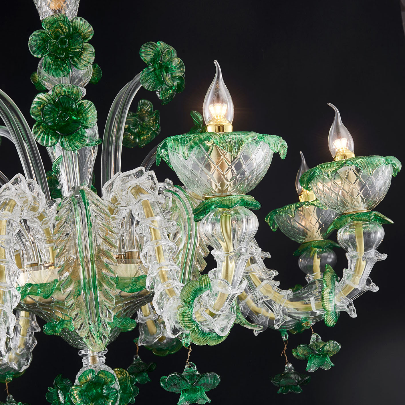 Lush green-edged petals meet transparent S-shaped layered arms — this handmade glass flower chandelier is a